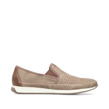 Ovaj model muških mokasina RIEKER je savršen za letnje dane, kada ćete ceniti kombinaciju atraktivnog izgleda i savršene udobnosti. Gornji deo od prave kože ukrašen je suptilnim perforiranim uzorkom i kontrastnim elementima u boji koji cipelama daju moderan karakter. Na ulošku se nalazi diskretan logo brenda RIEKER, koji podvlači njihovu vrhunsku izradu. Za maksimalnu udobnost pri nošenju, sa strane uloška su ušivene elastične gumene trake, koje olakšavaju obuvanje i istovremeno garantuju savršeno prilagođavanje obliku stopala. Mekani kožni uložak pruža prijatan osećaj pri svakom koraku, dok đon sa efektom amortizacije doprinosi stabilnosti i rasterećuje svaki korak. Ove mokasine predstavljaju idealnu kombinaciju stila, udobnosti i funkcionalnosti – savršeno će upotpuniti vašu letnju odeću za posao, za šetnje gradom i za slobodne trenutke tokom odmora.