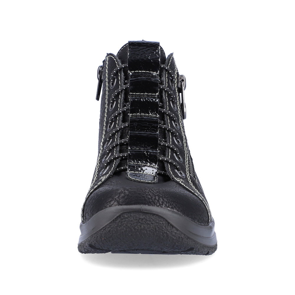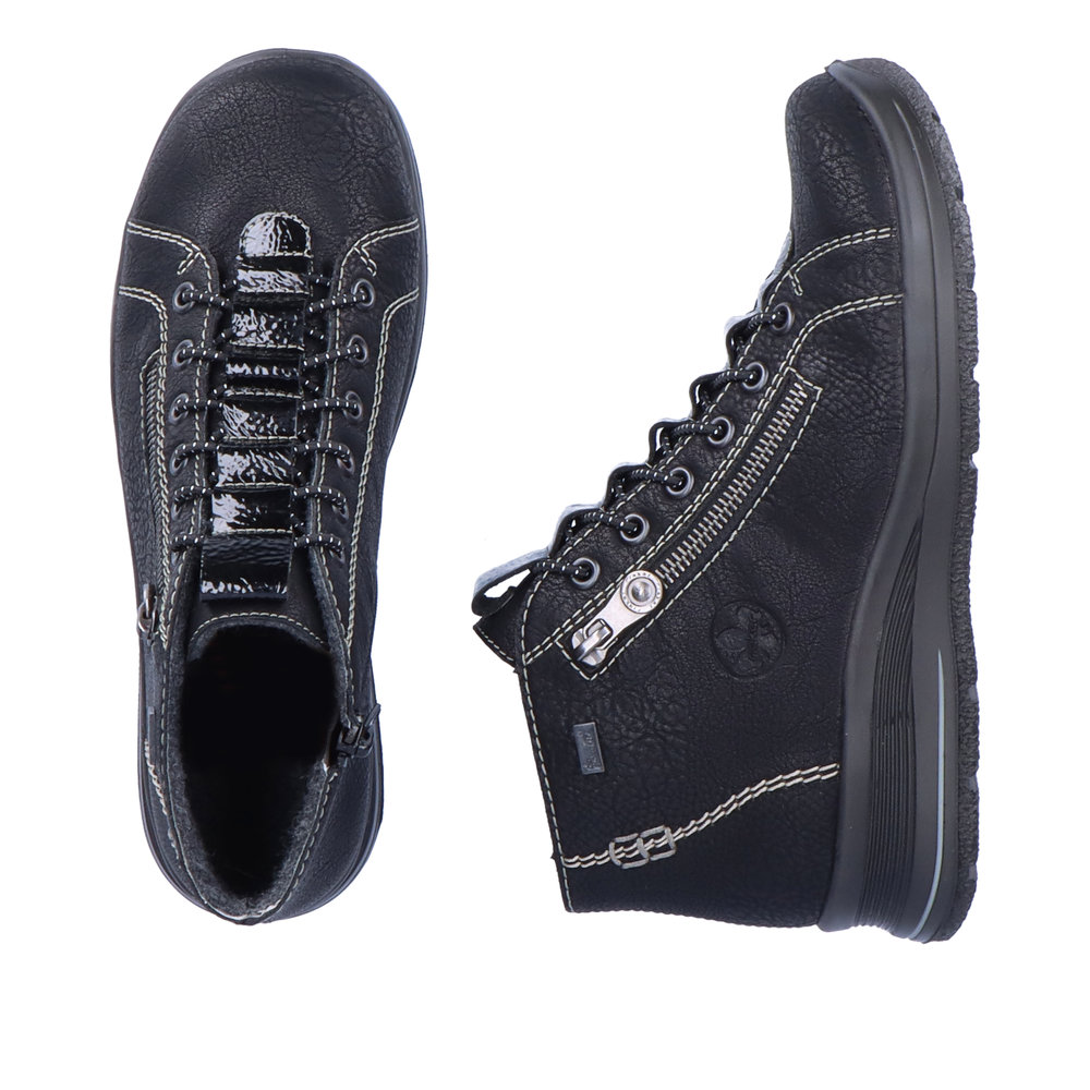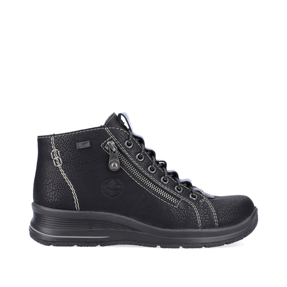 RIEKER ženske gležnjače su garantovano prava stvar za vaše zimske dane. Kombinacija više materijala na gornjem delu cipele je ukrašena finim šavovima u svetlijoj boji i nefunkcionalnim rajsferšlusom na spoljnoj strani cipele. Dekorativni element su i elastične pertle prošivene sjajnom trakom. Zatvarač sa unutrašnje strane cipela će olakšati pričvršćivanje. Ovaj model sa funkcionalnim TEKS slojem koji obezbeđuje vodootpornost, a opet prozračnost. Možete ih koristiti i kada sa porodicom šetate kroz zimski pejzaž i na putu do posla.