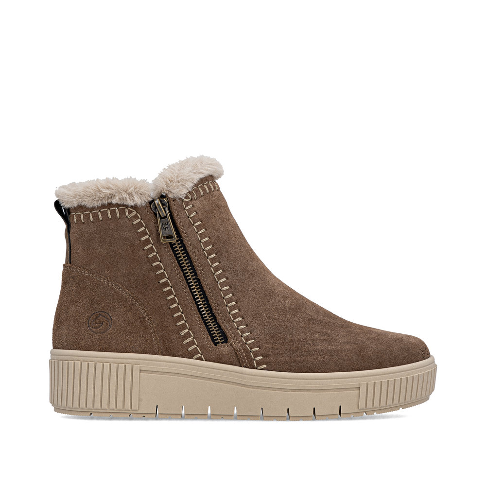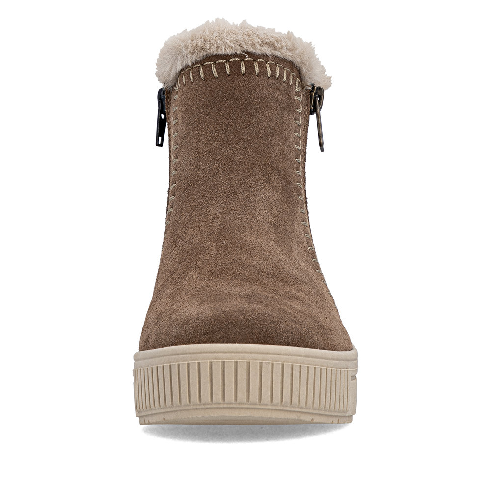 REMONTE obuća – ovo je viša linija brenda RIEKER, ove cipele karakteriše odlična kombinacija gornjih materijala. Ovaj zimski model brenda RIEKER u braon boji je idealna kombinacija praktičnosti i stilskog dizajna. Kožno gornjište ukrašeno prepoznatljivim šavovima sa svetlim koncem daje cipelama jedinstven izgled, koji je istaknut krznenim obrubom na gornjoj ivici. Unutrašnja topla postava od ovčje vune će držati vaša stopala toplim čak i tokom hladnih zimskih dana i možete se uvući u nju zahvaljujući bočnim rajsferšlusima koji omogućavaju lako obuvanje. Praktičan dodatak je uložak koji se može skinuti, koji ne samo da omogućava lako održavanje ili zamenu, već i stvara savršenu udobnost pri svakom koraku svojom mekoćom, a viši stabilni đon doprinosi savršenoj udobnosti. Ovaj model je odličan izbor za žene koje preferiraju funkcionalne cipele sa ukusnim dizajnom – bilo da su za grad, posao ili zimske šetnje.