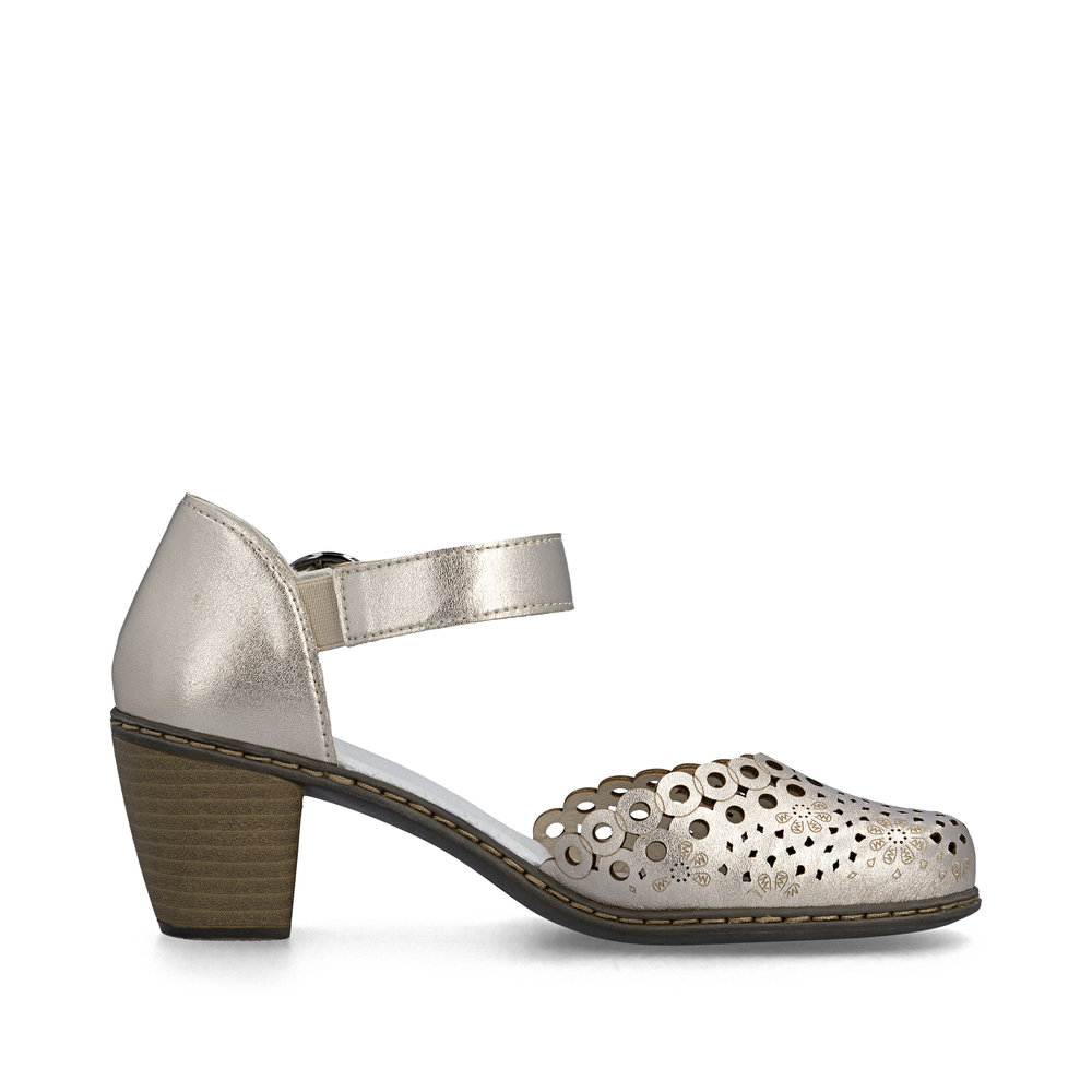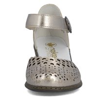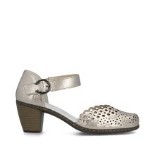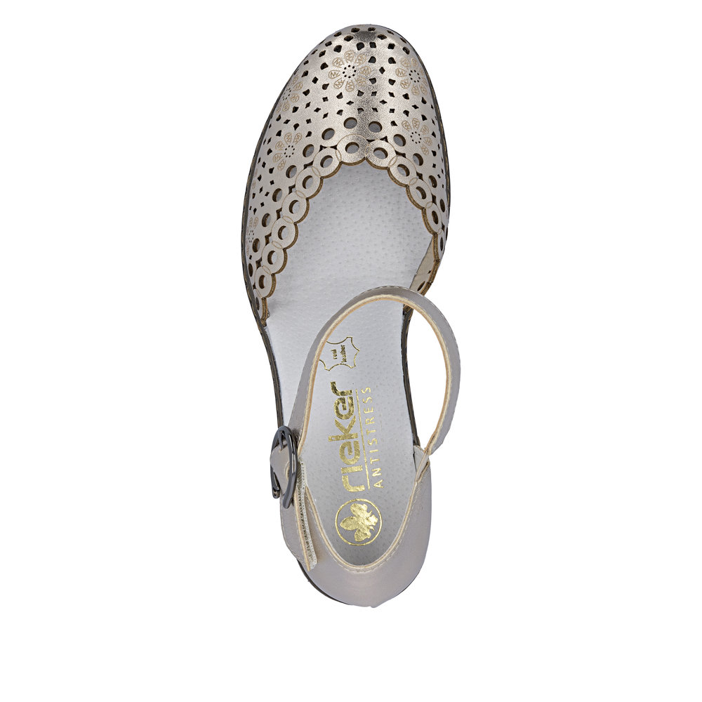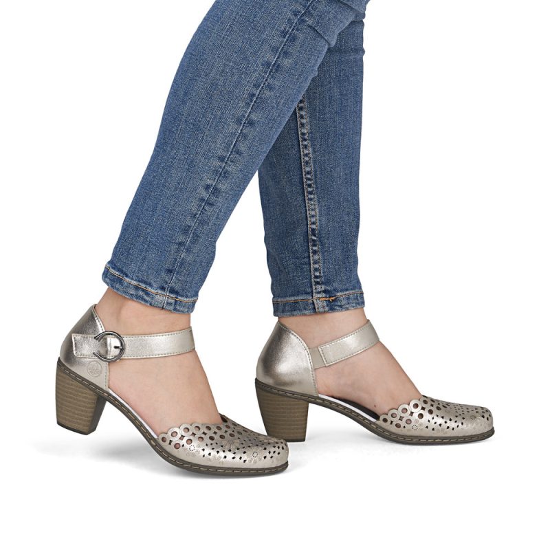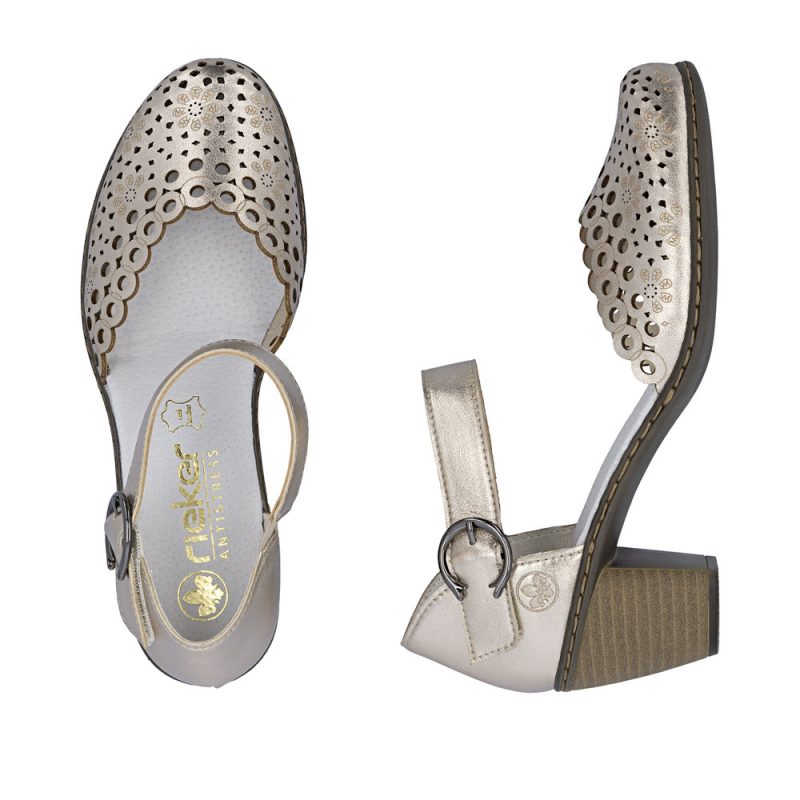 Drage dame, ove originalne sandale brenda RIEKER mogu istaći stil i ženstvenost svake nosilice. Metalni odsjaji kožnog gornjeg dela zajedno sa perforiranim uzorkom daju cipelama jedinstven izgled koji odmah privlači pažnju. Lakoću obuvanja obezbeđuje praktična traka opremljena čičak trakom, koja omogućava udobno oblačenje i istovremeno precizno prilagođavanje cipele obliku stopala. Peta nežno ističe ženstvenost i elegantno optički produžava noge, dok đon opremljen tehnologijom za amortizaciju garantuje udobnost pri svakom koraku. Ove sandale kombinuju modnu eleganciju sa praktičnim detaljima i udobnošću, što ih čini idealnim ne samo za radne dane, već i za slobodno vreme ili društvene prilike.
