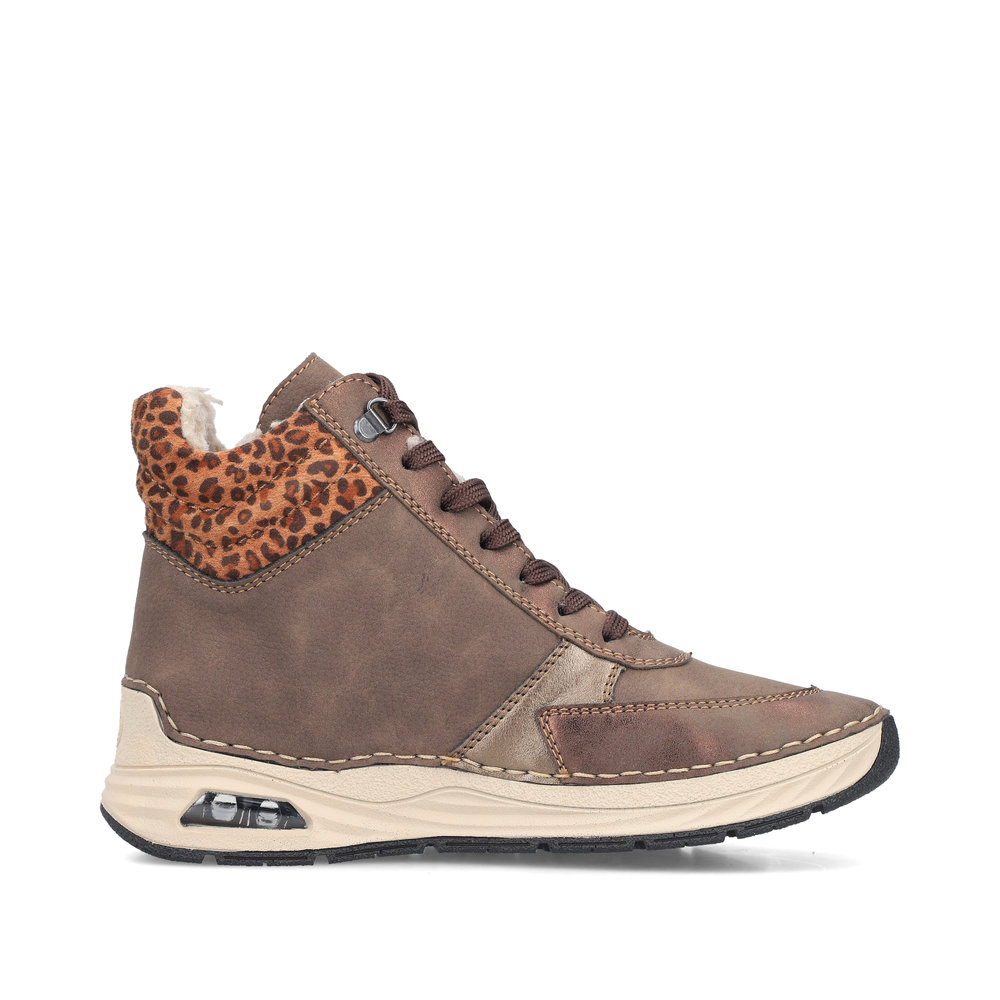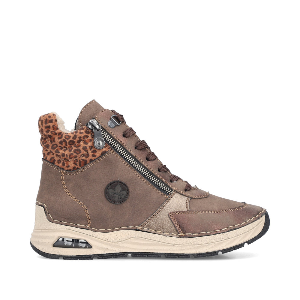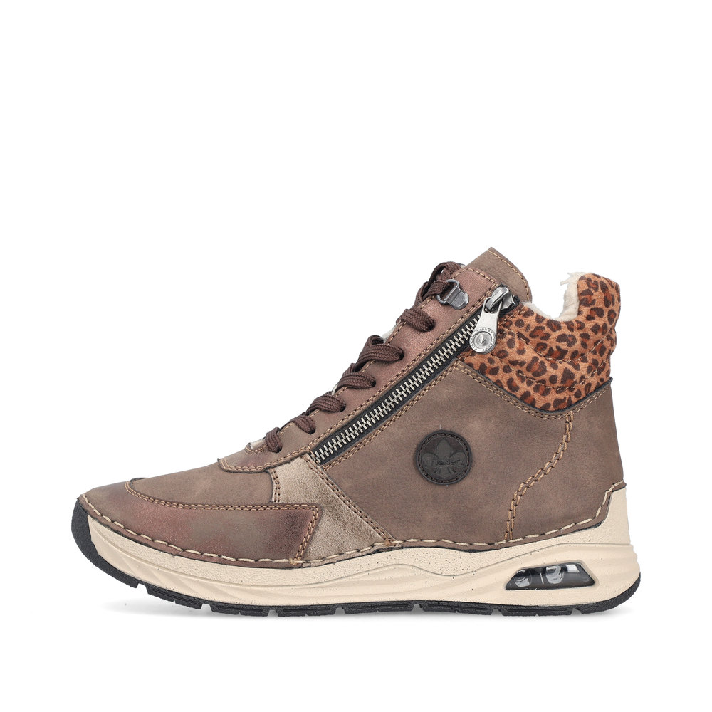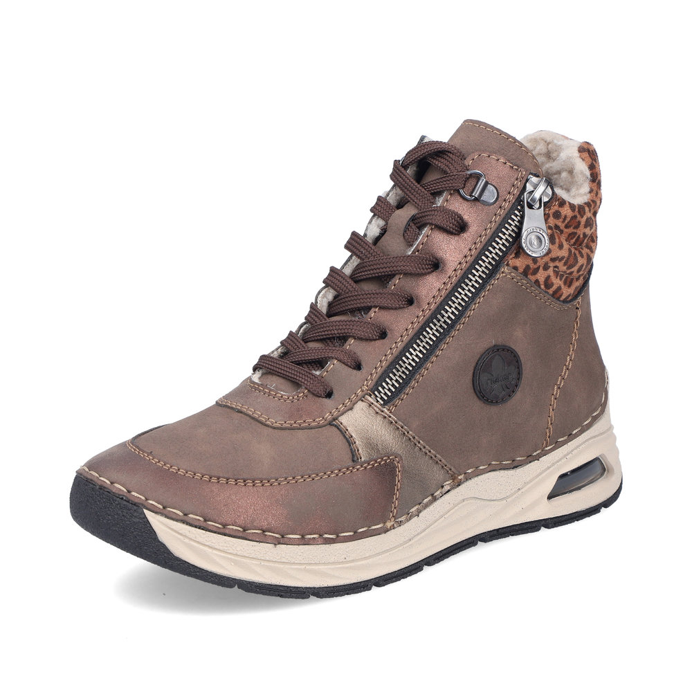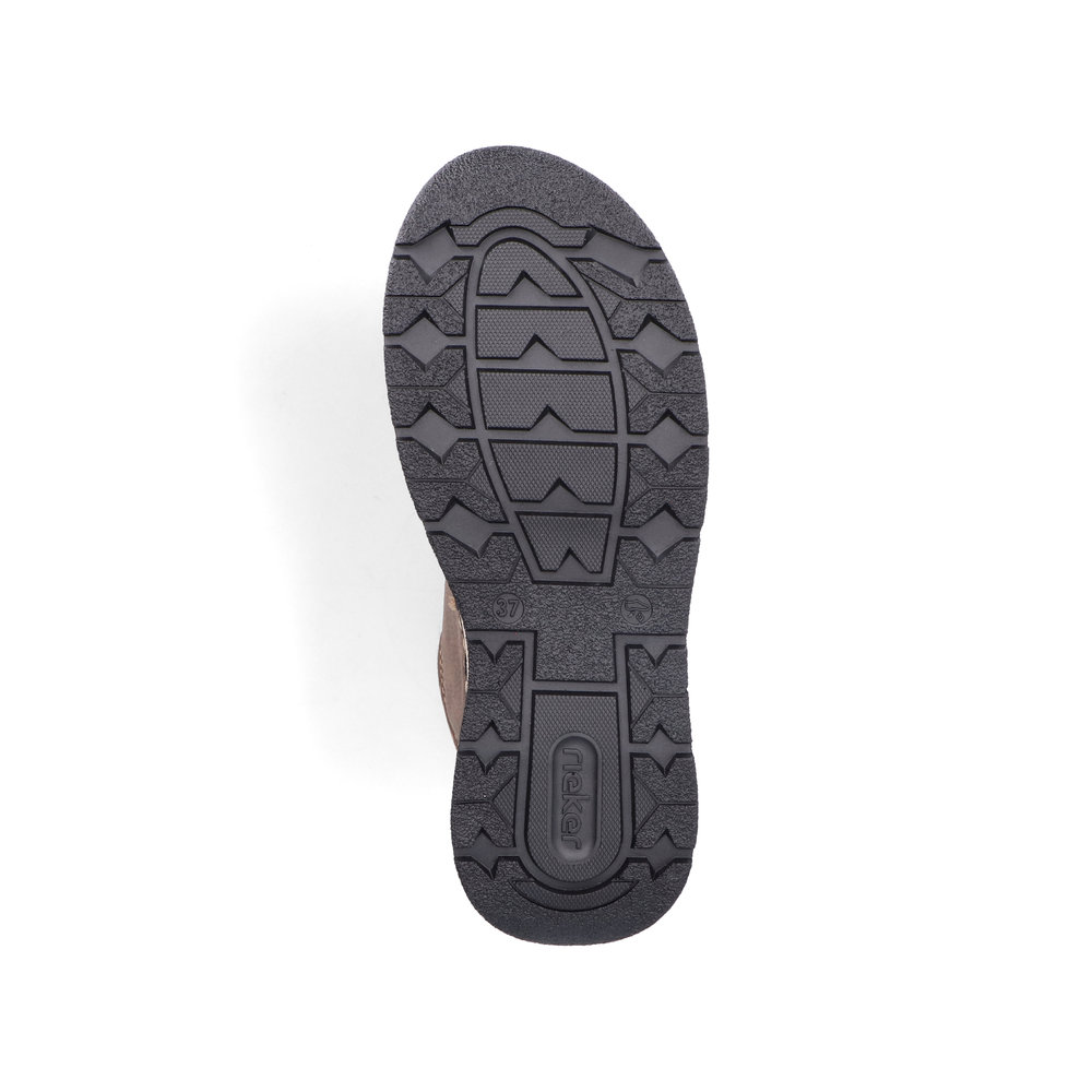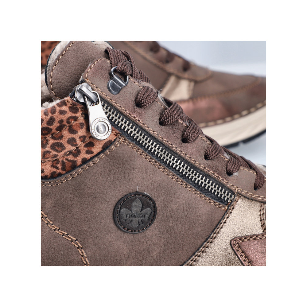 Ove RIEKER gležnjače će na prvi pogled impresionirati svojim originalnim izgledom, stvorenim impresivnom kombinacijom materijala i prepoznatljivim gornjim rubom sa životinjskim motivom – detaljem koji cipelama daje jedinstven stil. Sa strane se nalazi diskretan logo brenda, dok praktično vezivanje zajedno sa patentnim zatvaračem na gornjem delu stopala obezbeđuje lako obuvanje i savršeno prianjanje stopalu. Izolovana postava će pružiti prijatnu toplinu čak i u hladnijim danima, a mekani uložak će osigurati udobnost pri svakom koraku. Stilski đon ne samo da savršeno dopunjuje celokupni dizajn, već i efikasno apsorbuje udarce pri hodanju. Idealan izbor za žene koje traže kombinaciju originalnosti, udobnosti i funkcionalnosti u jednom modelu za obične jesenje ili zimske dane.