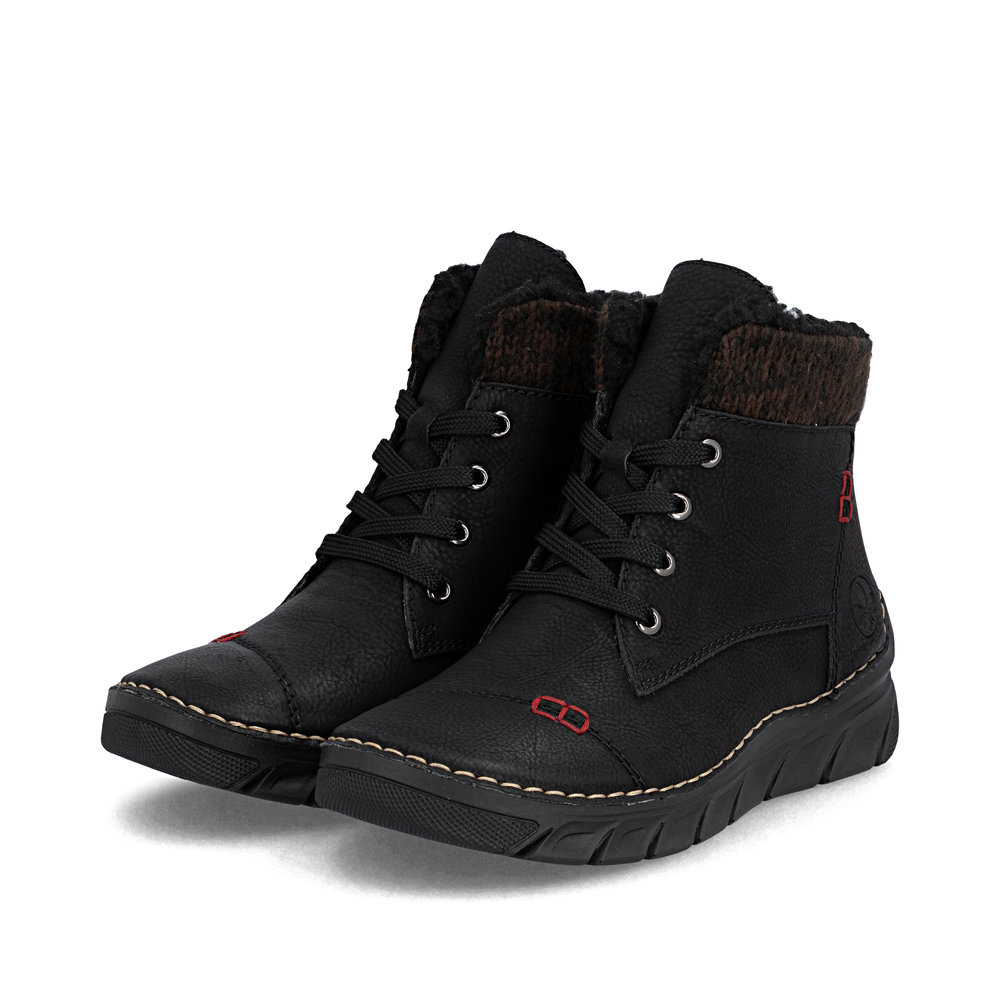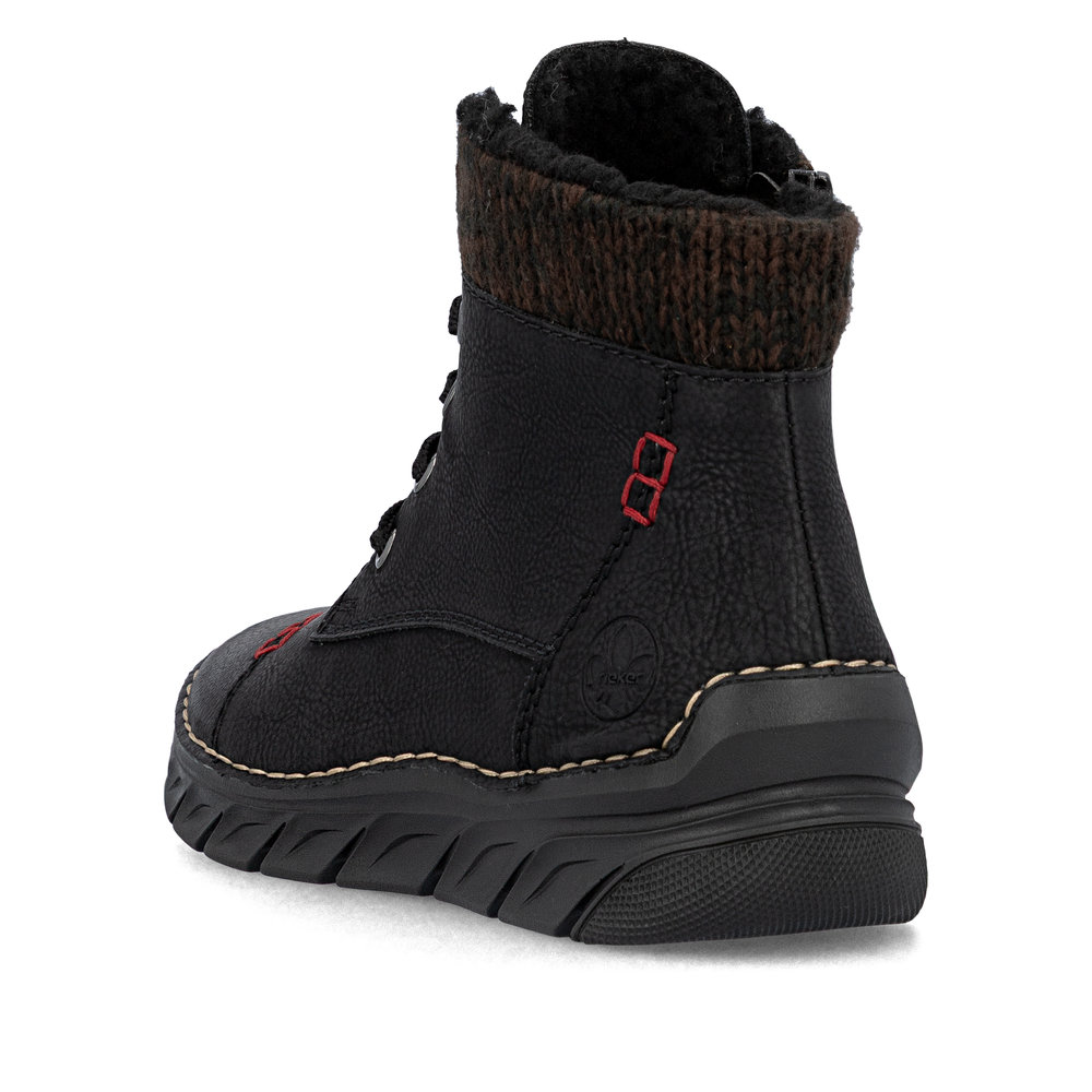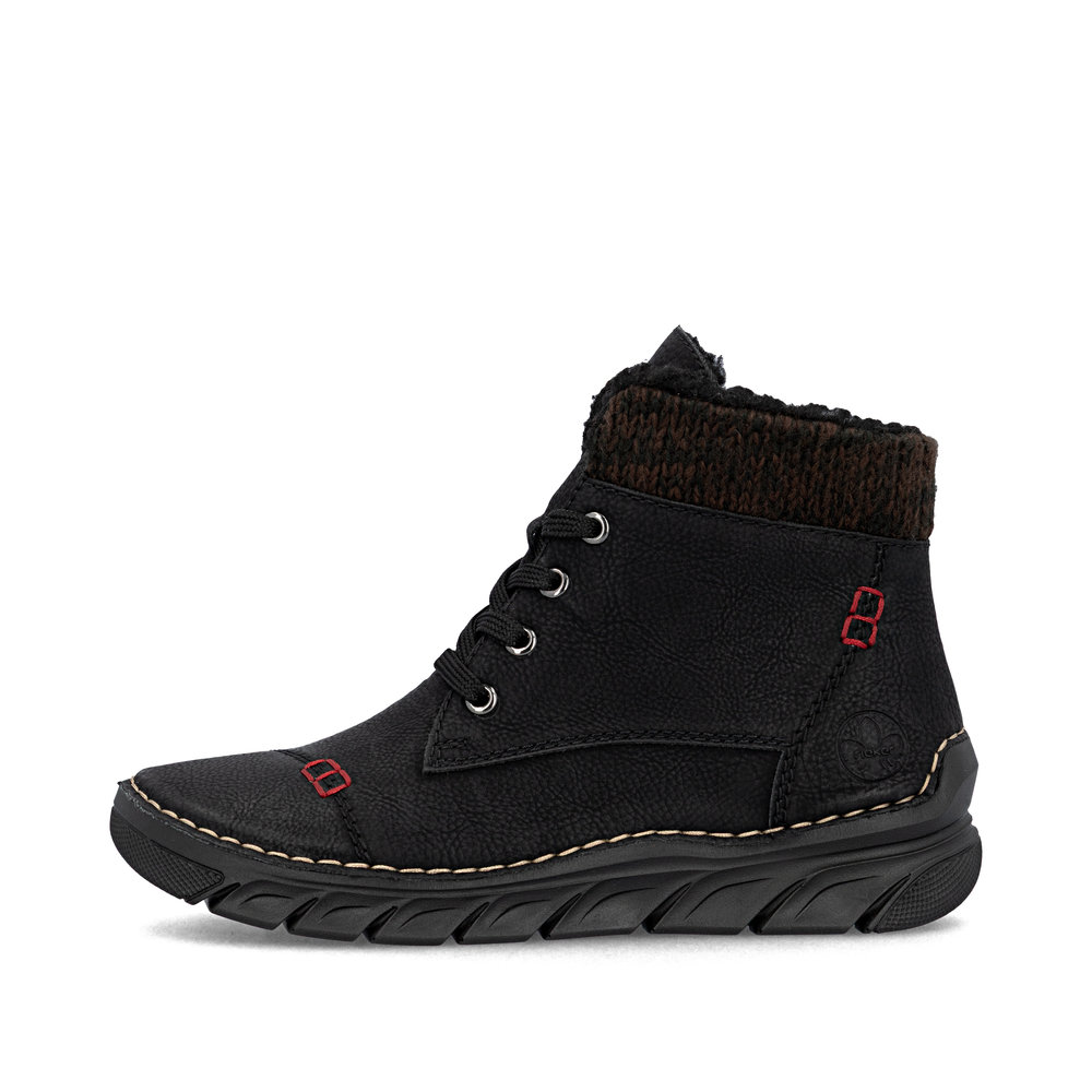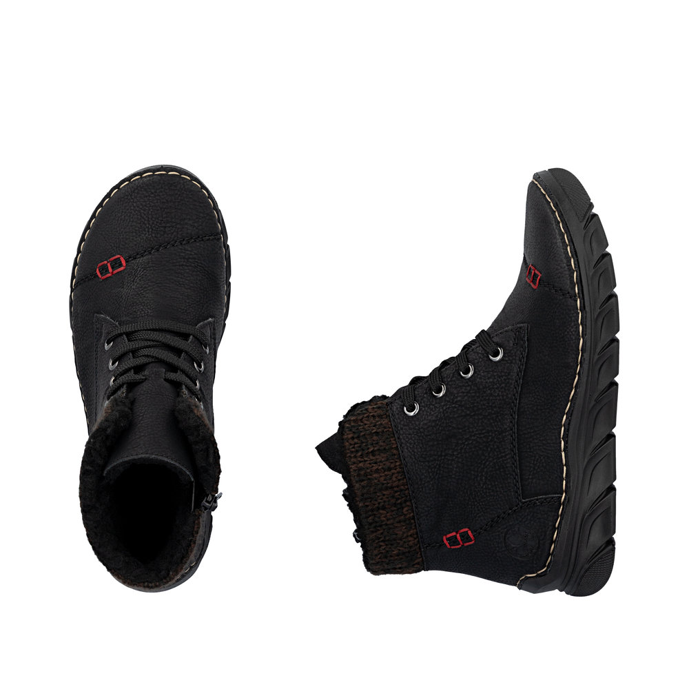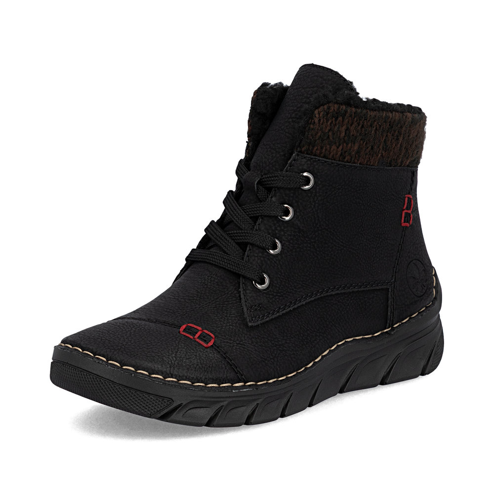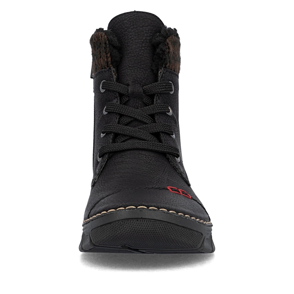 Ženske gležnjače RIEKER u crnoj boji predstavljaju idealnu kombinaciju bezvremenskog dizajna i maksimalne udobnosti. Fini šavovi, tekstilni ukras na gornjoj ivici i diskretan logo brenda ističu stilski izgled ovog modela. Praktično vezivanje upotpunjeno bočnim patentnim zatvaračem osigurava lako obuvanje i savršeno prilagođavanje stopalu. U hladnijem vremenu, cenićete unutrašnju izolaciju, dok lagan i fleksibilan đon sa Antistres tehnologijom efikasno apsorbuje udarce i povećava udobnost sa svakim korakom. Idealne cipele za svakodnevno nošenje, bilo za posao ili slobodno vreme.