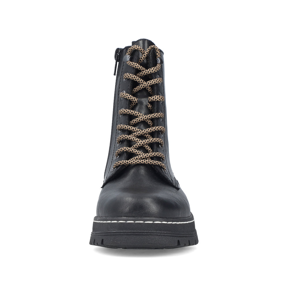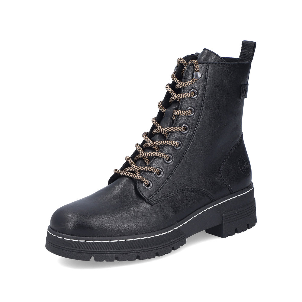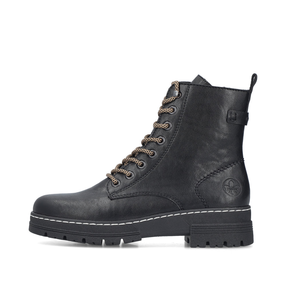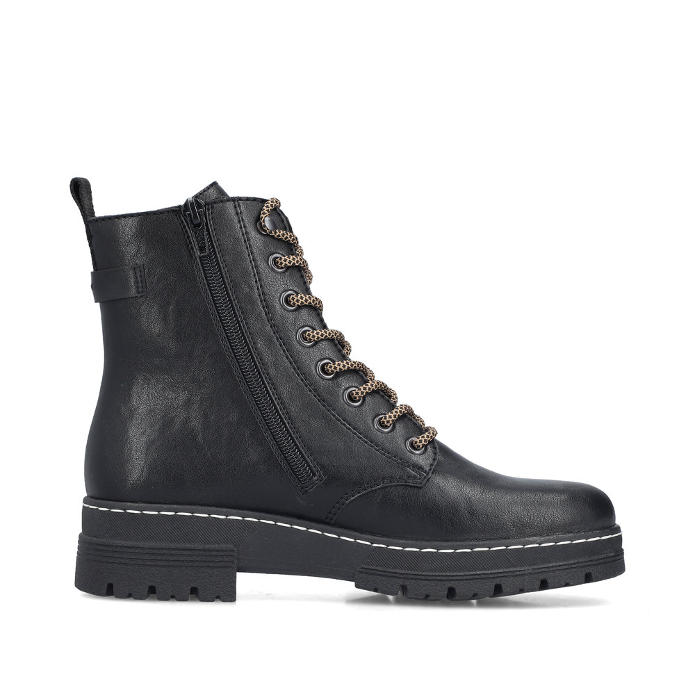 Ove Riker kratke čizme u univerzalnoj crnoj boji su odličan izbor za hladne dane. Gornji deo je upotpunjen prepoznatljivim vezivanjem sa atraktivnom čipkom i stilskim detaljem pozadi, što cipelama daje moderan dodir. Zahvaljujući praktičnom patentnom zatvaraču sa unutrašnje strane, obuvanje je brzo i praktično, dok vezivanje omogućava individualno podešavanje. Udobnost je obezbeđena mekim, uklonjivim uloškom i prijatnom tekstilnom postavom. Đon koji apsorbuje udarce garantovaće prijatan hod čak i uz duže nošenje, a njegov masivni izgled upotpunjuje moderan dizajn. Ove cipele kombinuju stil i udobnost – idealne su za svakodnevno nošenje ili šetnje.
