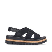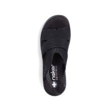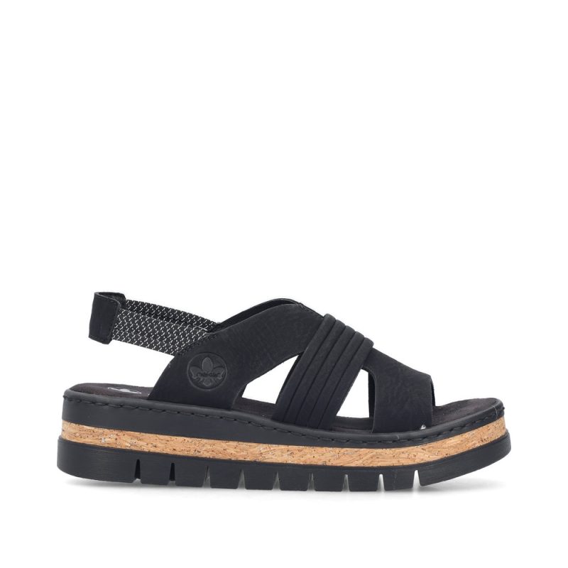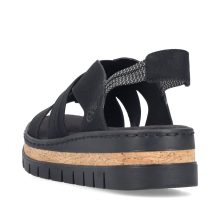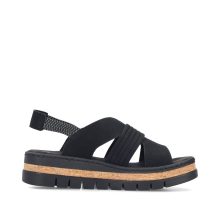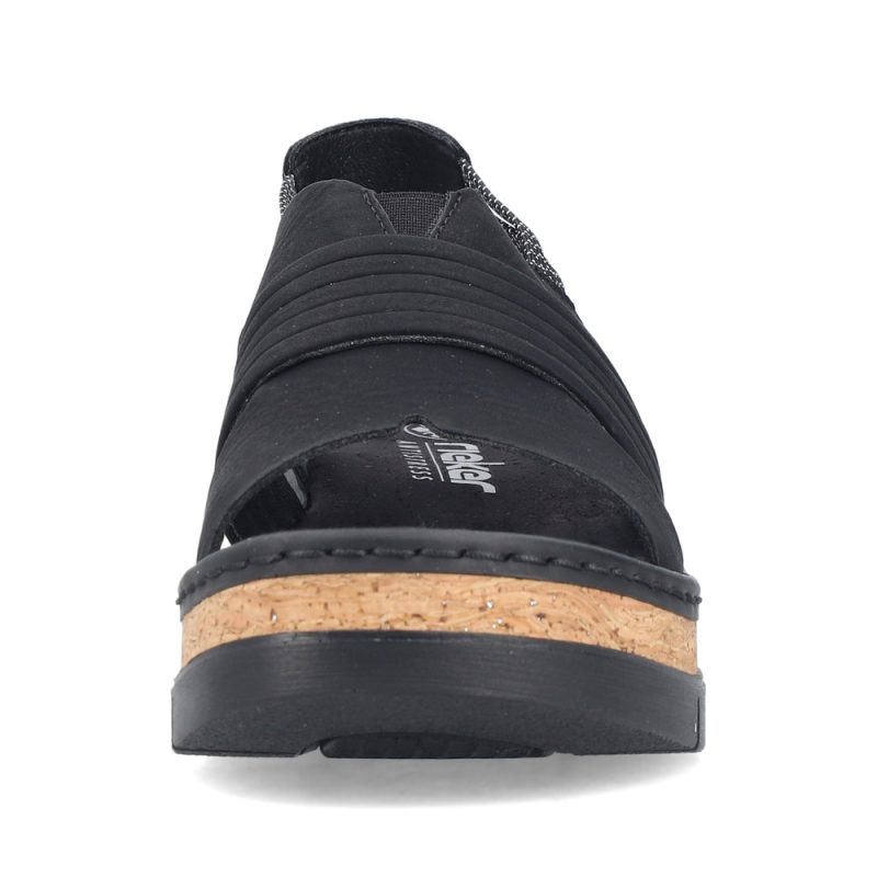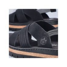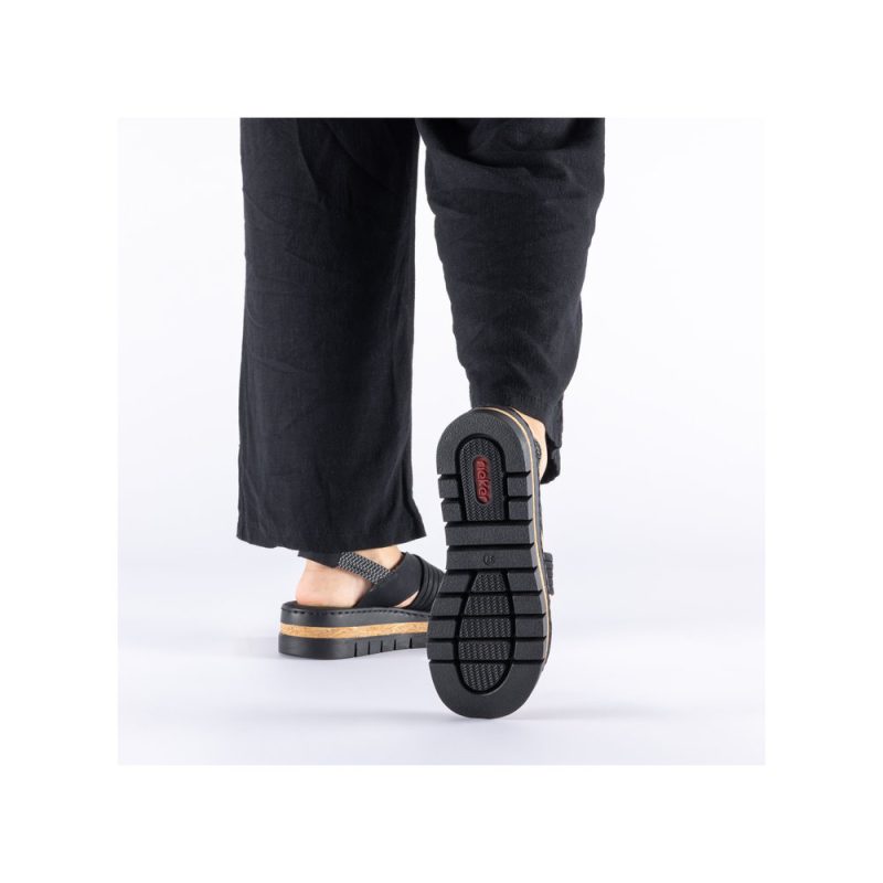 Crne RIEKER sandale će vas očarati svojom impresivnom kompozicijom elegantno presavijenih kaiševa koji dodaju ženstveni šarm. Elastične zadnje kaiševe olakšavaju obuvanje i prilagođavanje vašem stopalu. Mekani tekstilni uložak razmazuje vaša stopala prijatnim korakom, dok viši đon apsorbuje udarce i dodaje stabilnost, dok njegov dizajn podvlači jedinstveni karakter sandala. Ove sandale nisu samo cipele – one su izraz vašeg stila, samopouzdanja i radosti od svakog letnjeg koraka.
